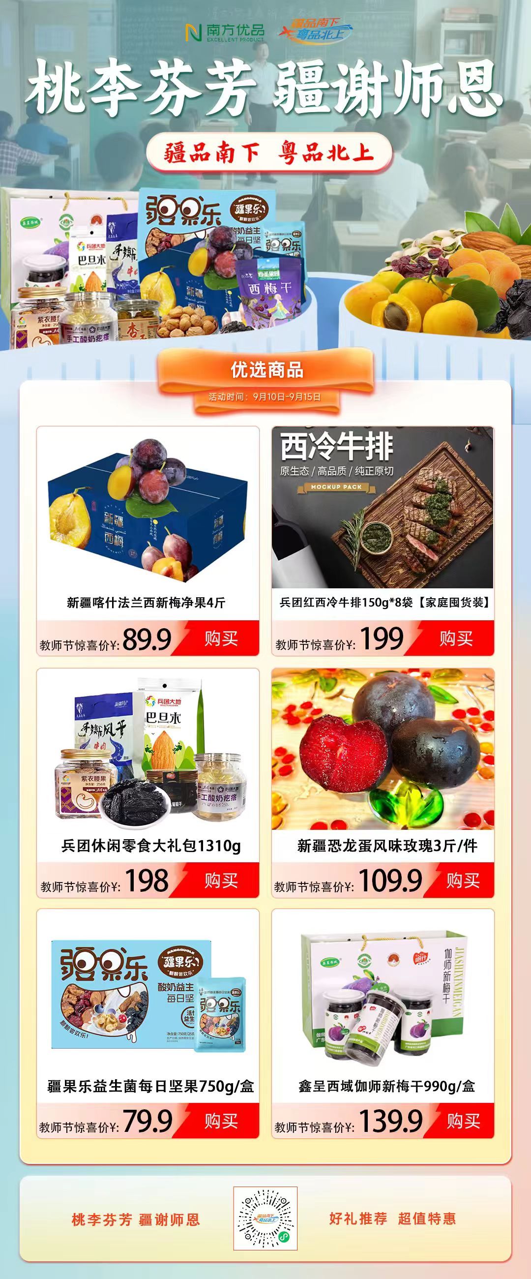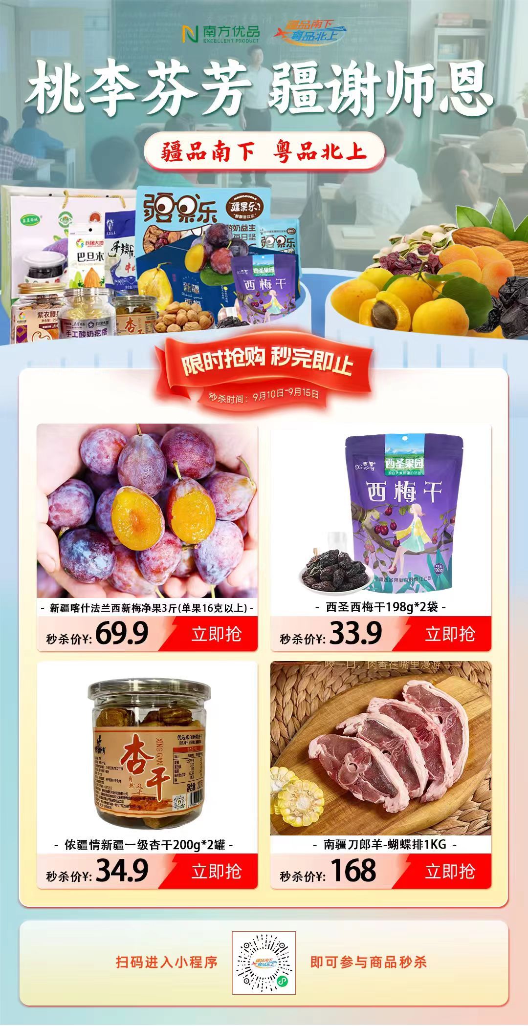 桃李芬芳,“疆”谢师恩。教师节的意义,不仅是向恩师道一声“谢谢”,更是将这份感恩化作行动,温暖更多人。这个教师节,“疆品南下 粤品北上”线上主平台等您来,用一份甜礼,连接两地的情谊与温暖。